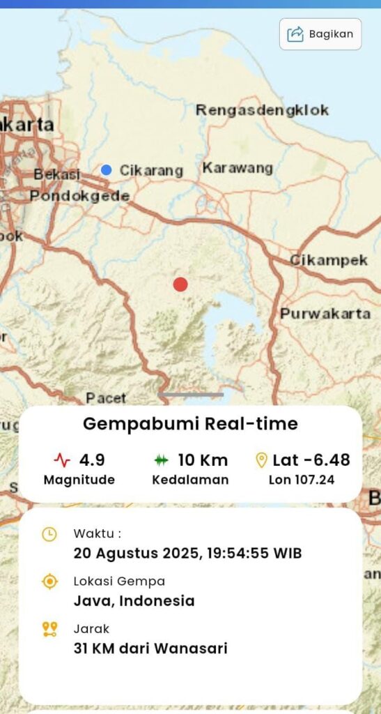 Insidecikarang.com || Kab.Bekasi – Sebuah gempa bumi dengan kekuatan Magnitudo 4,9 mengguncang wilayah Kabupaten Bekasi, Jawa Barat, pada Rabu malam, 20 Agustus 2025, pukul 19.54 WIB.