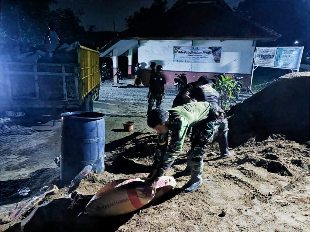 Meski malam telah larut, semangat gotong royong tak surut. Penerangan tambahan dipasang di area kerja agar proses pembangunan bisa terus berjalan lancar hingga target rampung tepat waktu.