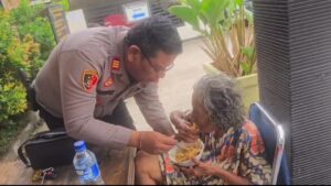 Tak Segan Suapi Ibu Terlantar, Wakapolsek Cikarang Utara Banjir Pujian