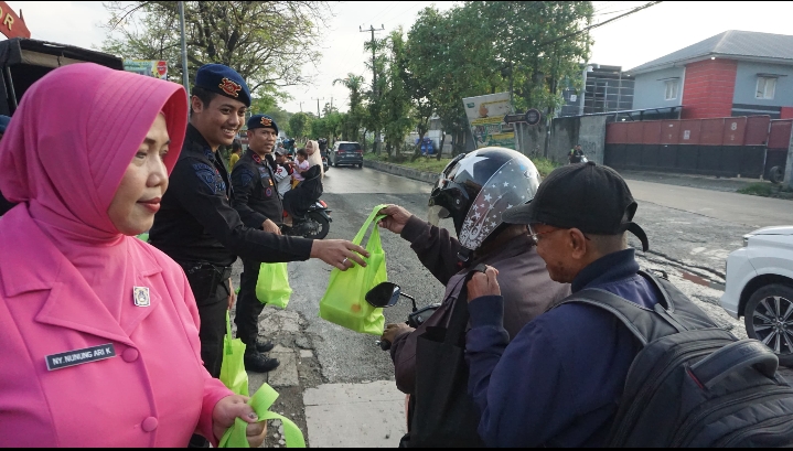 Personel Batalyon D Pelopor Bersama Bhayangkari Bagikan Takjil kepada Masyarakat di Cikarang Pusat